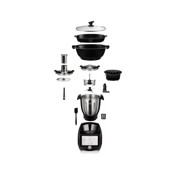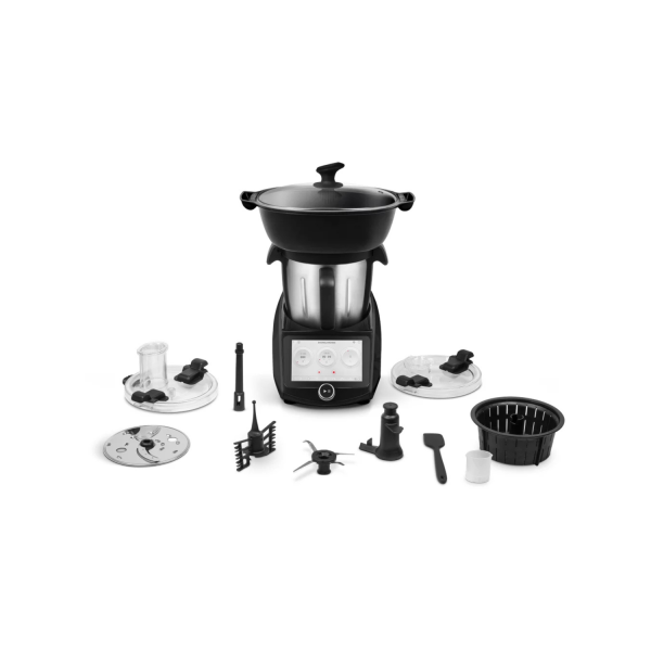 - Accessoires : couvercle anti-projections, découpe légumes, disque(s) éminceur, disque(s) râpeur, emulsionneur, lame de pétrissage, lame universelle, mélangeur, panier vapeur, balance intégrée